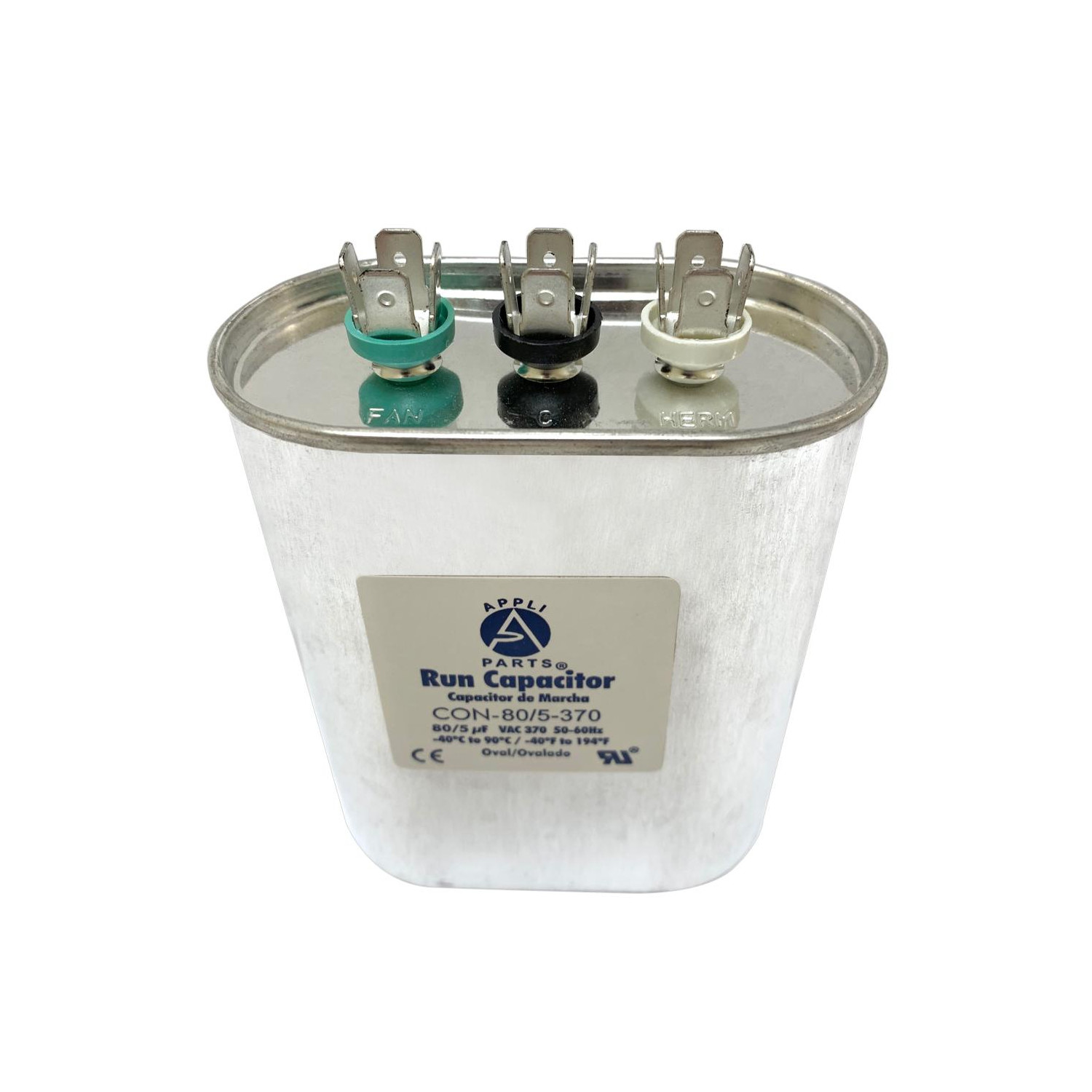 Appli Parts CON-80/5-370 Condensador Capacitor de Marcha 80+5 Mfd uF (microfaradios) 370VAC CBB65 Universal Aire acondicionado y otras aplicaciones Ovalado UL, 7.7cm Ancho 4.5cm Prof 10.2cm Alto