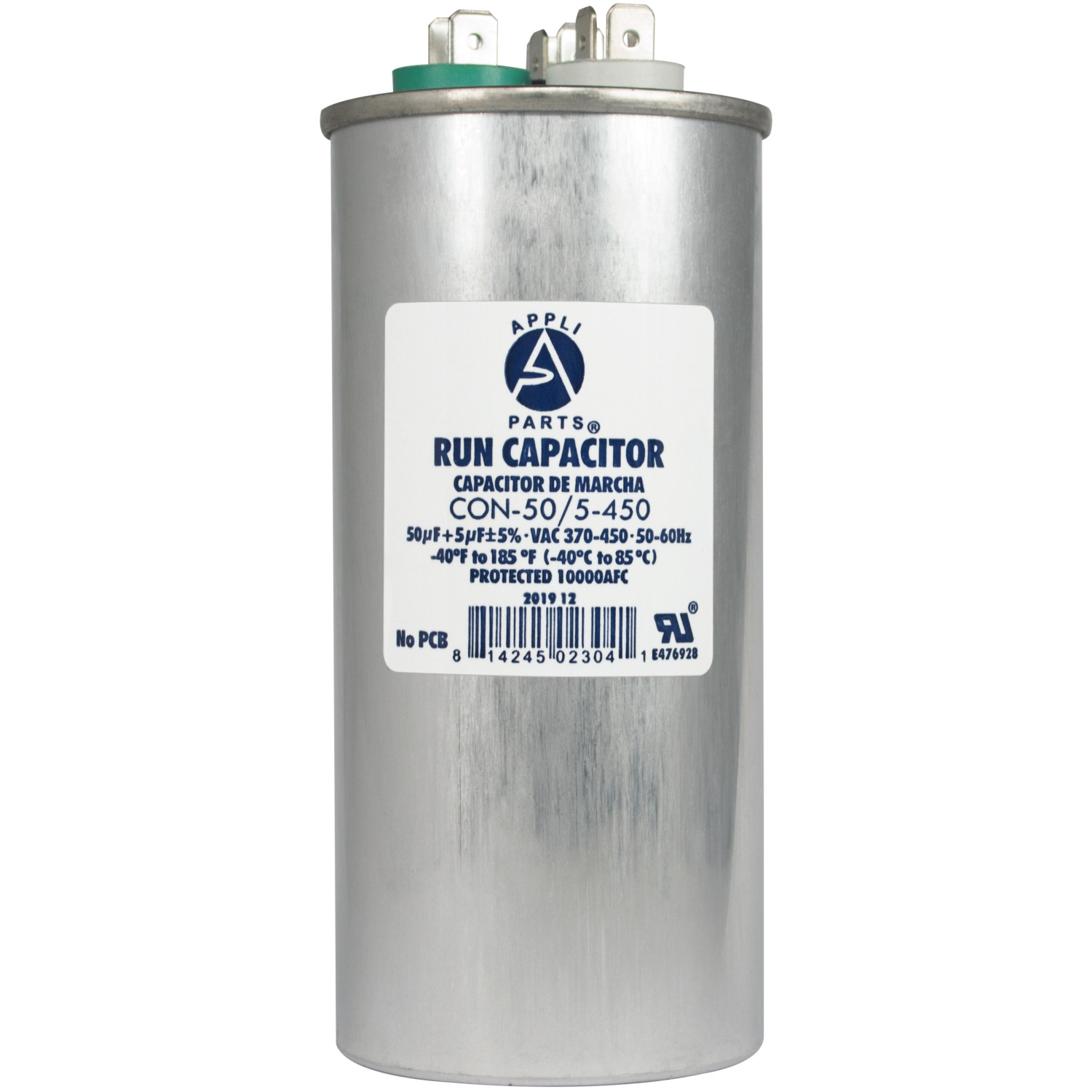 Appli Parts CON-50/5-450 Condensador Capacitor de Marcha 50+5 Mfd uF (microfaradios) 370VAC o 450VAC CBB65 Universal Aire acondicionado y otras aplicaciones Redondo UL E476928 13.3cm Alto 5.4cm Ancho