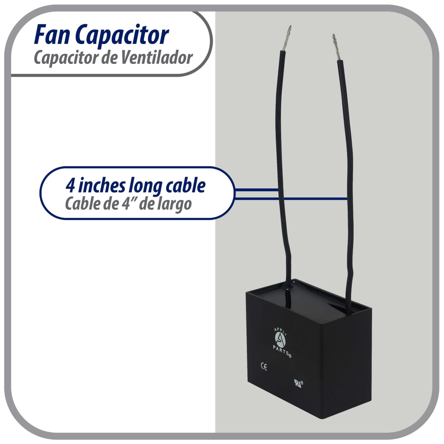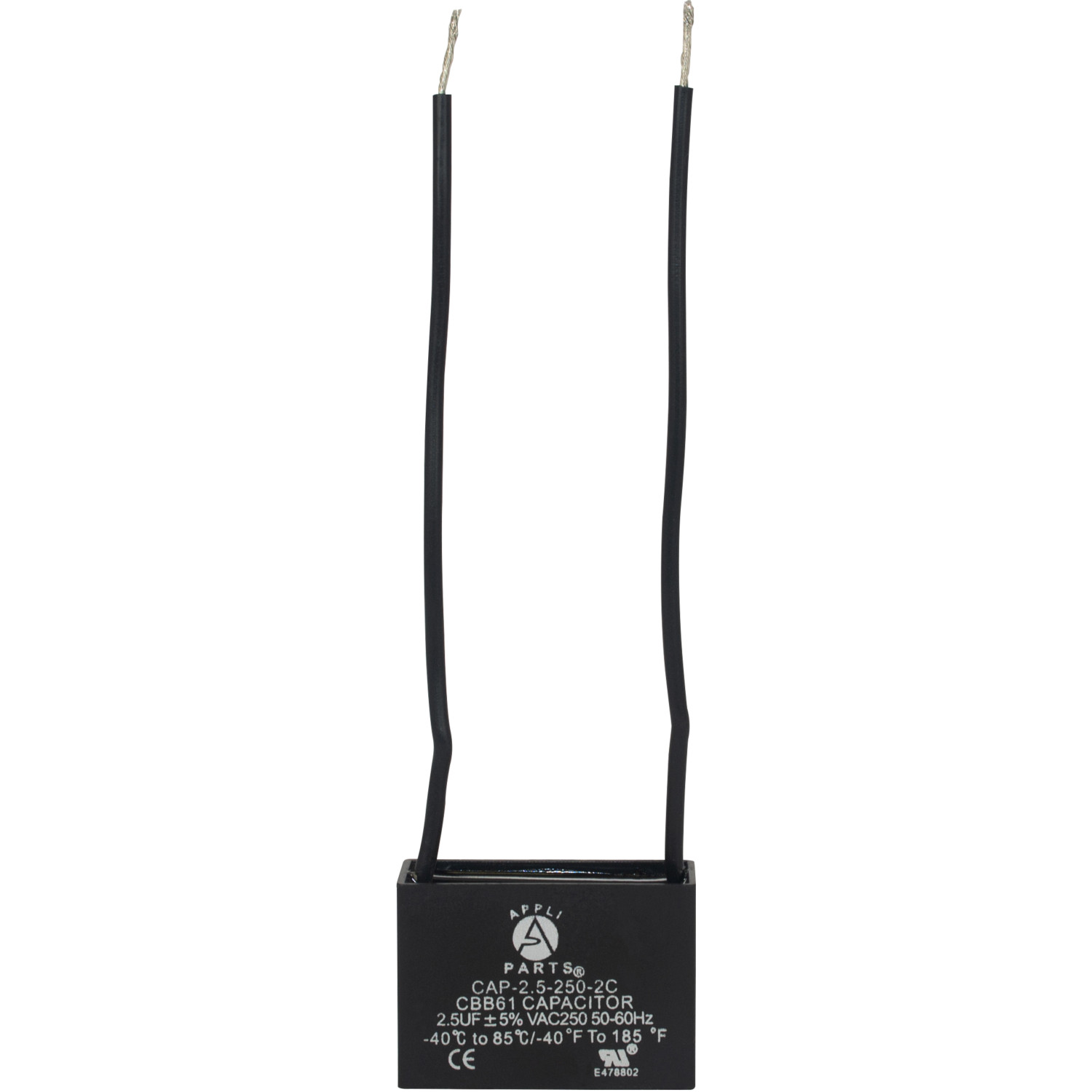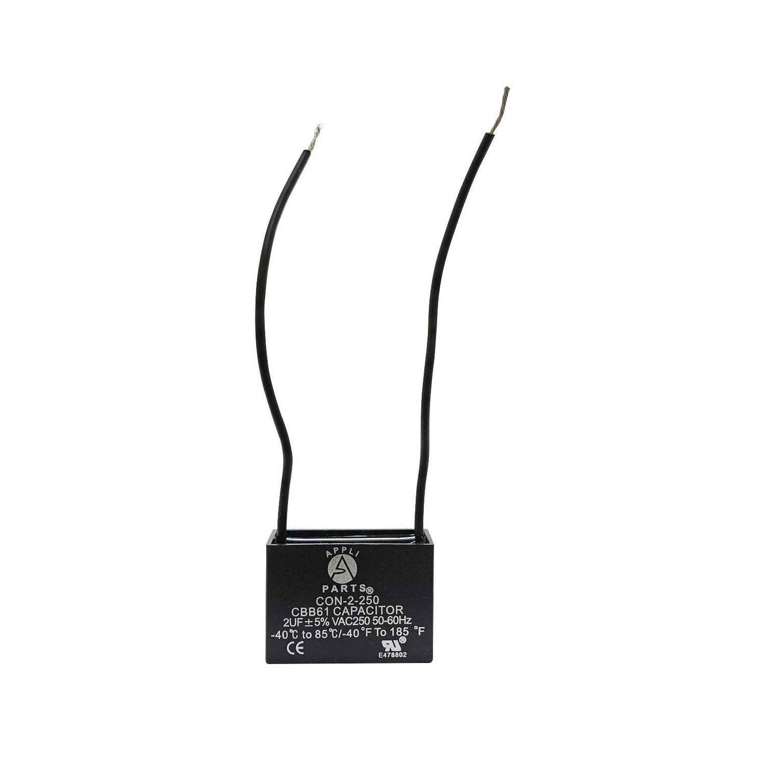 Appli Parts CAP-2-250-2C Condensador Capacitor de ventilador 2 mfd (microfaradios) uf 250VAC con 2 cables compatible con cualquier marca de igual capacitancia 3.7cm Ancho, 1.5cm Prof, 2.6cm Alto