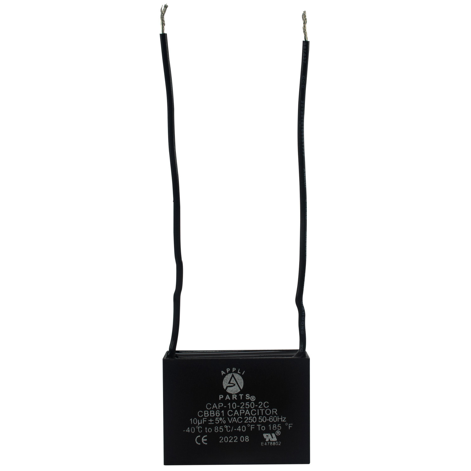 Appli Parts CAP-10-250-2C Condensador Capacitor de ventilador 10 mfd (microfaradios) uf 250VAC con 2 cables compatible con cualquier marca de igual capacitancia 4.7 ancho x 2.6 profundidad x 3.7cm