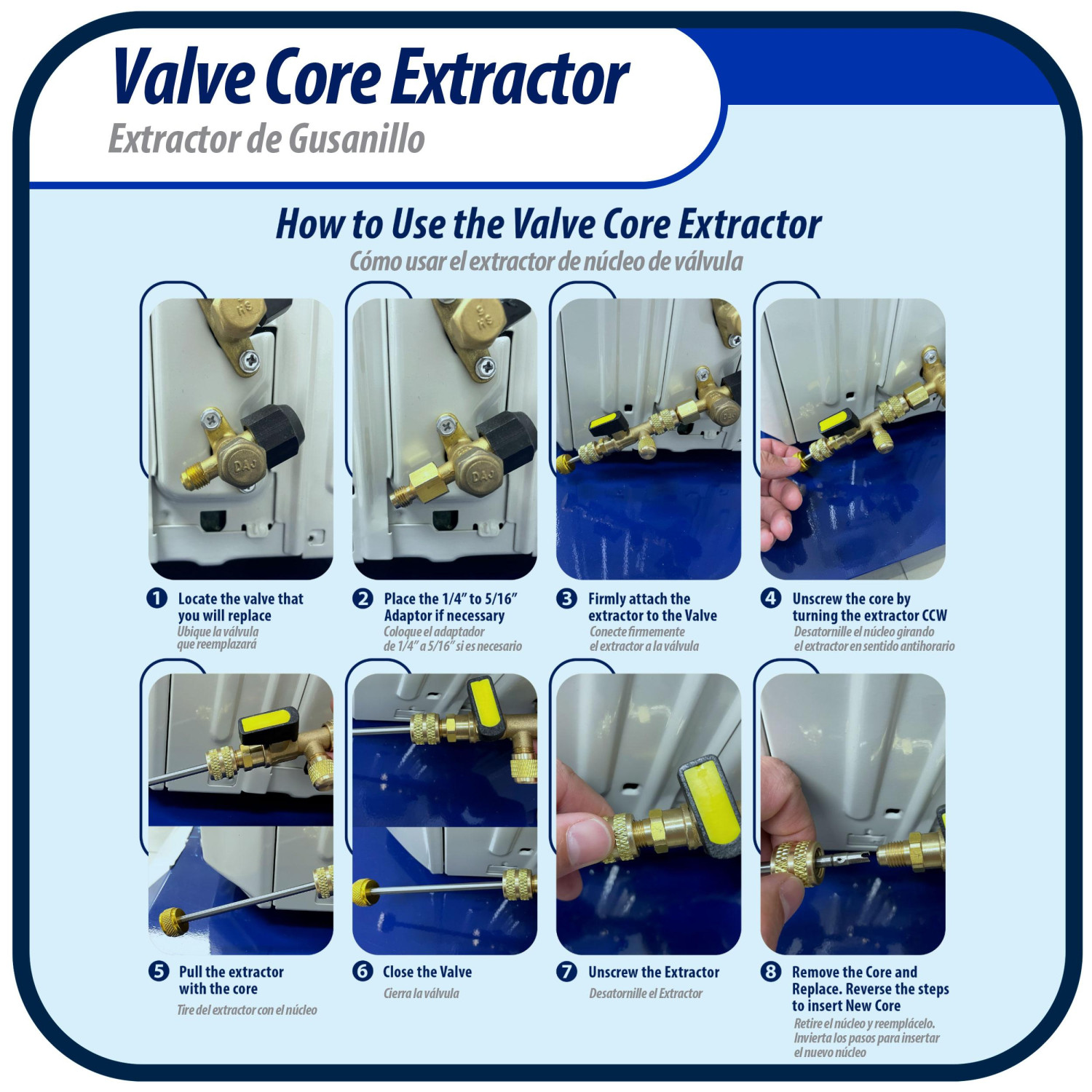 - Como Funciona: Conecte firmemente la herramienta a la valvula que se va a reemplazar, desenrosque el nucleo de la valvula y extraigala. Cierre la valvula y desenrosque el extractor. Recupere y reemplace el nucleo. Inserte la herramienta extractora. Abra la valvula. Atornille el nuevo nucleo de la valvula. Recupera la herramienta