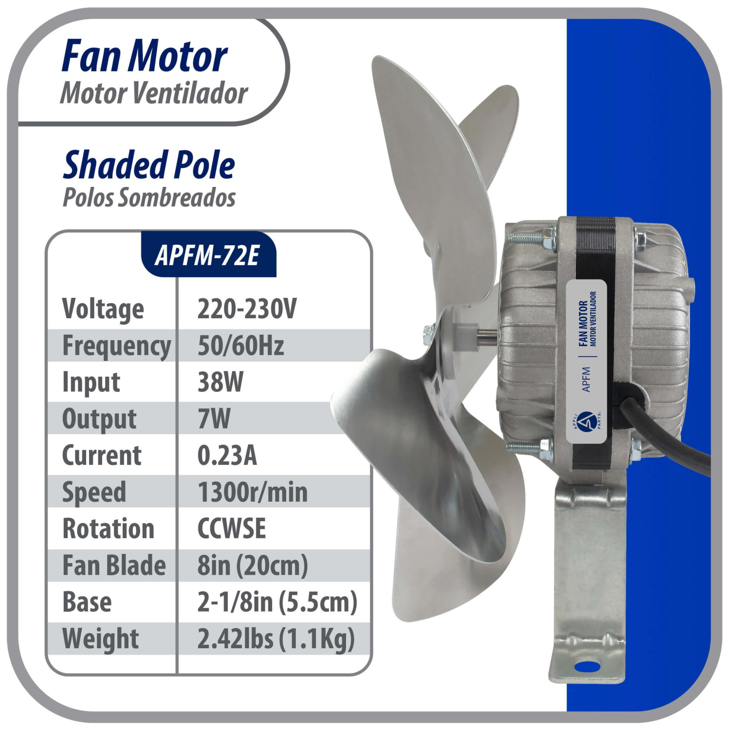 Appli Parts APFM-72E Motor Ventilador 7W Condensador y Evaporador 220V 60Hz 0.23A, Incluye Aspa de Aluminio de 20cm y Base de Montaje, Repuesto Universal para Equipos de Refrigeracion Comercial
