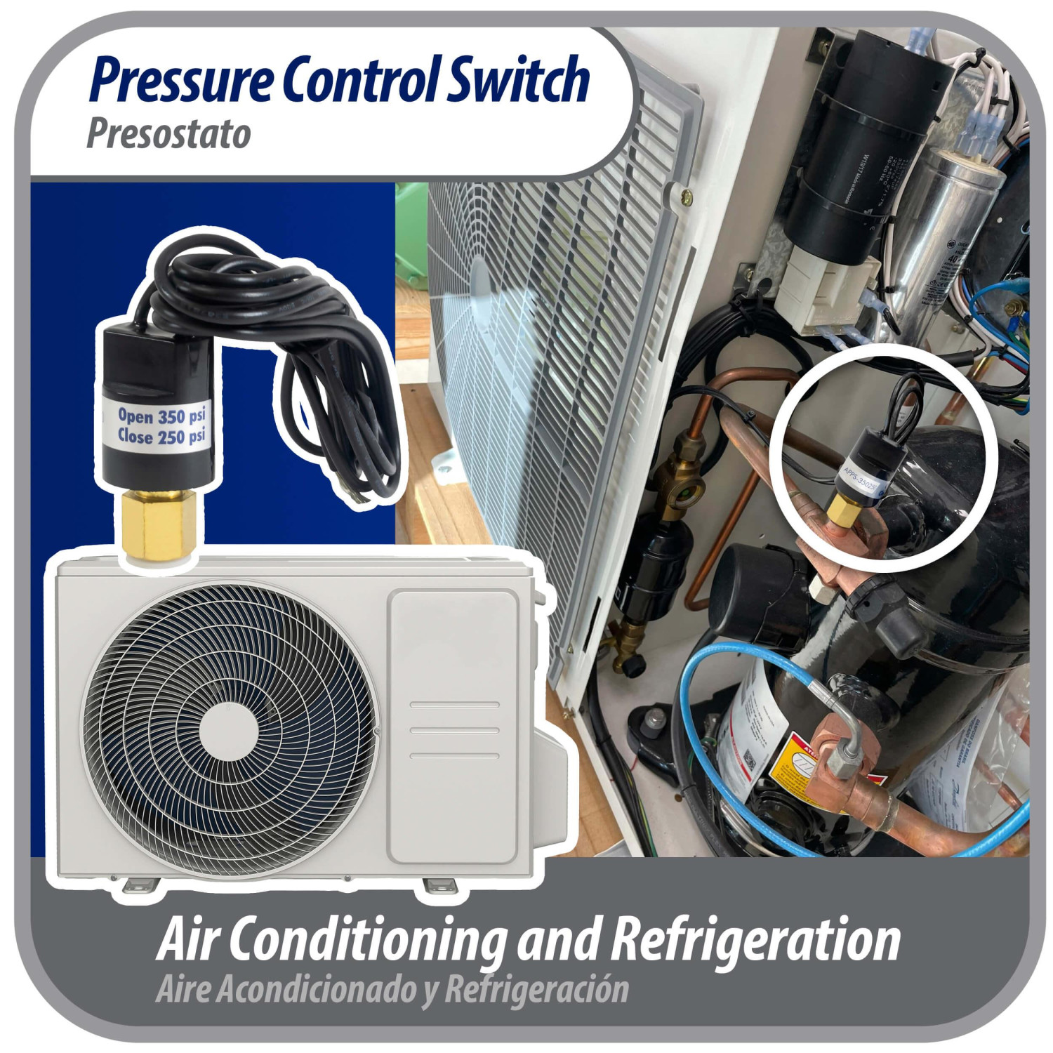 Appli Parts APPS-350250 Valvula Presostato R22 Alta, Abre 350 psi, Cierra 250 psi, 1 m Cable, SPST, 1/4 SAE Hembra, Reset Automatico, remplazo Universal para Aire Acondicionado