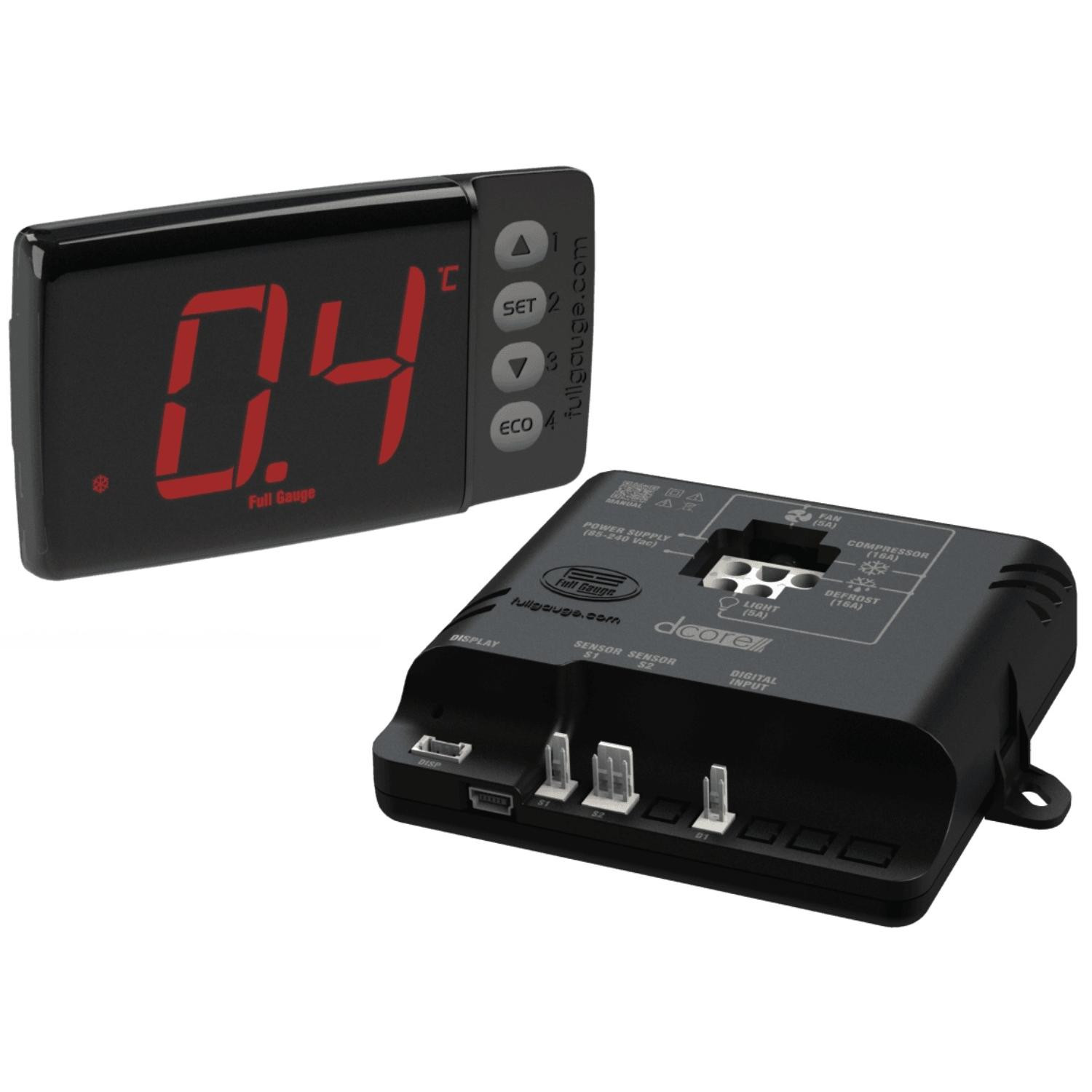 Full Gauge DCore Eco Controlador Electronico 110/220V, 2 Sensores, 1 Entrada Digital y 4 Salidas VCC para Compresores de Velocidad Variable, para Exhibidores Refrigerados, Congeladores, Cuartos Frios