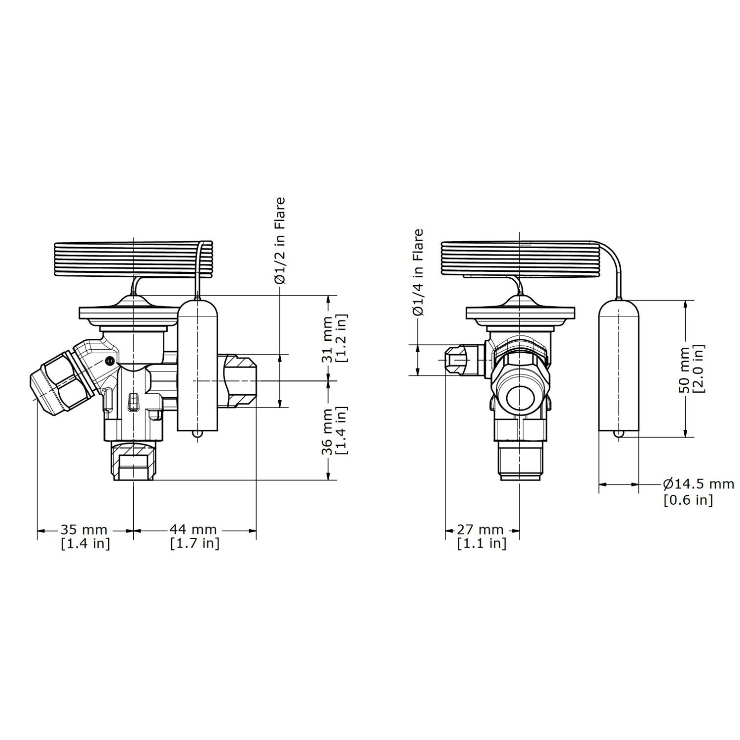 El tubo capilar de 59 pulg transmite la temperatura del bulbo a la valvula para ajustar el sobrecalentamiento.