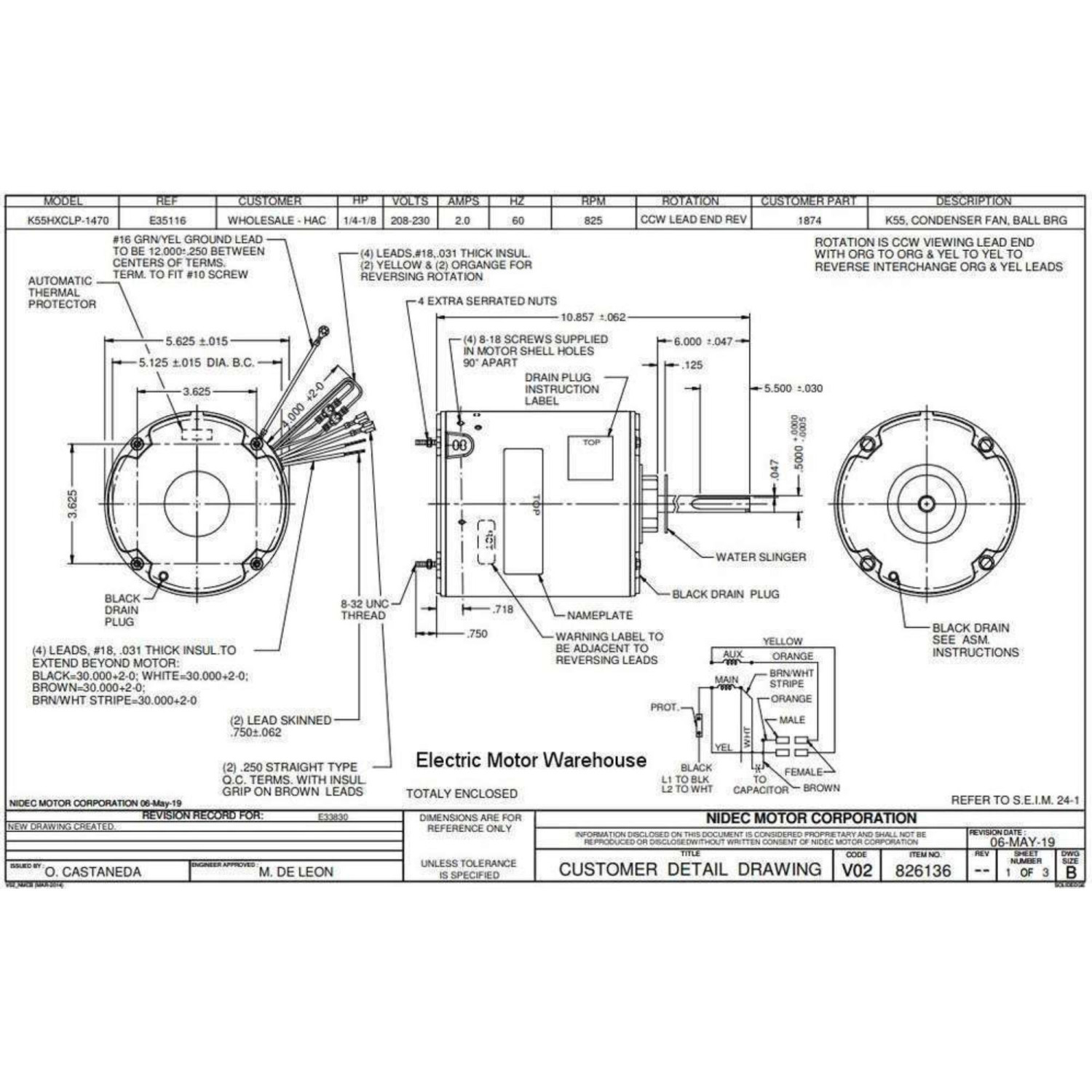 US Motors 1874 1/4-1/8 hp 825 rpm, 8 polos, 1 eje, TEAO Cerramiento, 1 velocidad, 5.5 diametro, CCW, Lead End, Reversible, 208-230 V, 60 hz, 1 ph, 5 mfd/370 VAC Capacitor 1874 K055CLP1470012B
