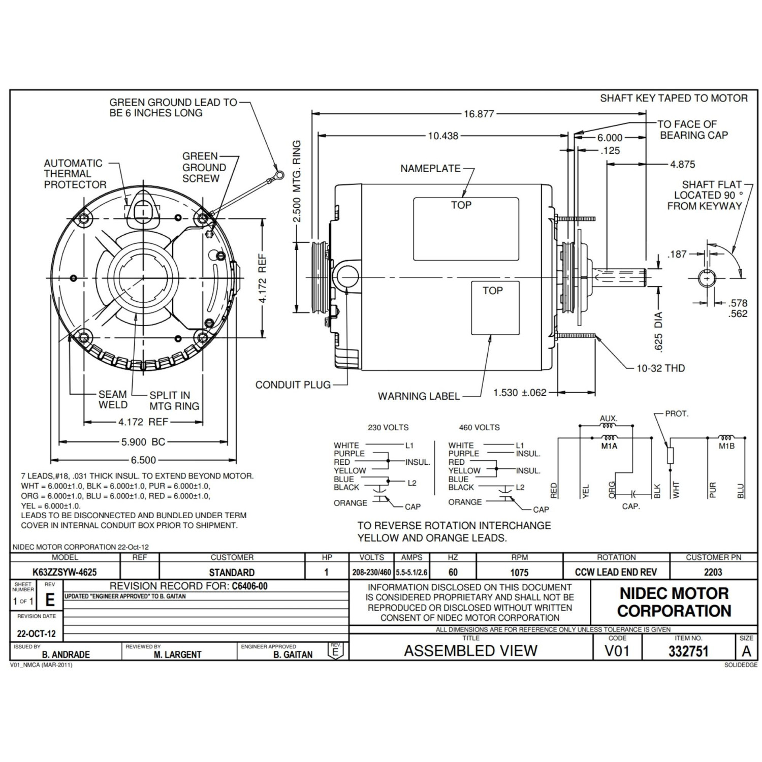 US Motors Mojave 1 hp 1075 rpm, 6 polos, 1 eje, ODAO Cerramiento, 1 velocidad, 6.3 diametro, CW, 17.5MFD 370V Capactor 208-230 V / 460 v / 60 hz / 3ph K063SYW4625012B