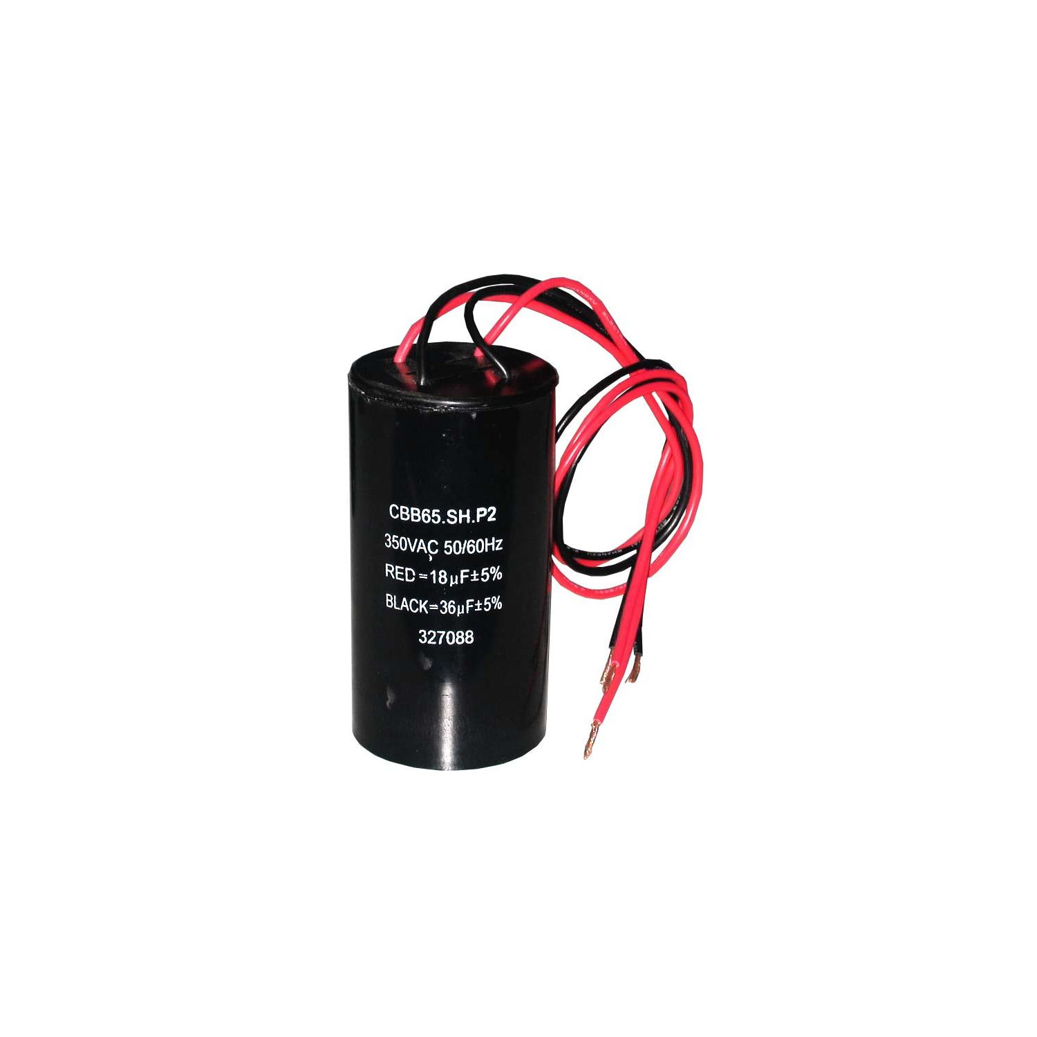 Appli Parts CAP-1836 Capacitor Dual para Lavadora 18/36 MFD 350 VAC 50/60 Hz CBB65 SH.P2 con cables rojo 18 MFD y negro 36 MFD, reemplazo para lavadoras LG Samsung Daewoo Nisato 327088